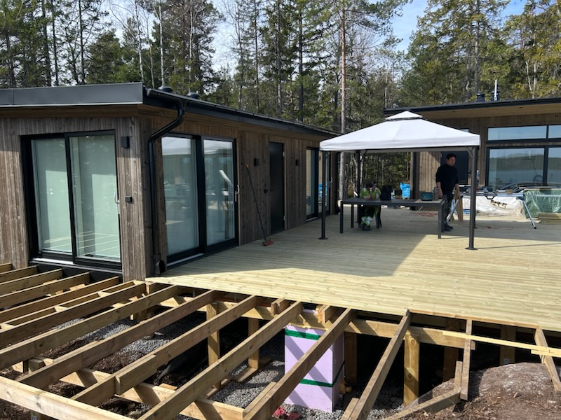 Uppe på ett berg i skärgården tar de nya stugorna form.